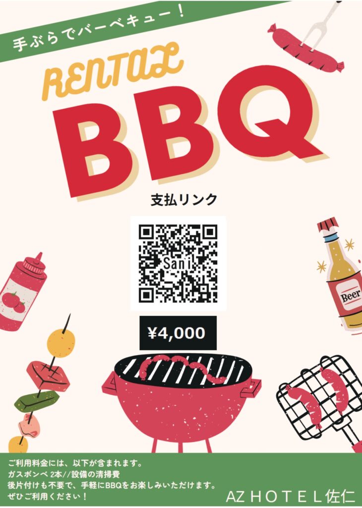 BBQに関して | BBQ設備のご利用について 当施設では、BBQ設備をご利用いただけます。 BBQセットの貸出しがあります、3Fのバルコニーでご利用ください。(火気使用は安全上の観点から禁止させて頂いておりますので、木炭などを利用したBBQはご遠慮ください) ●有料ブランの場合、 ご利用料金には、以下が含まれます。 ガスボンベ 2本 設備の清掃費 ご利用料金:4,000円(税込) お支払いは現地にて決済いただきます。 後片付けも不要で、手軽にBBQをお楽しみいただけます。ぜひご利用ください! ●上記をご利用されない場合は、 ・消耗品のガスなどはお客様でご準備お願いいたします。コールマン Coleman 純正LPガス燃料 Tタイプを準備頂けますと、BBQのコンロが利用可能です。利用後は洗浄し元の場所にお戻しください。 ・調味料を含む食材の提供等はおこなっておりませんのでお客様にてご準備頂くことになりますが、貸切りの雰囲気を味わって頂きながらみなさでお楽しみ頂けるかと思います。 |